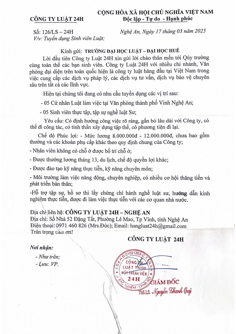 Công ty Luật 24H - Nghệ An thông báo tuyển dụng