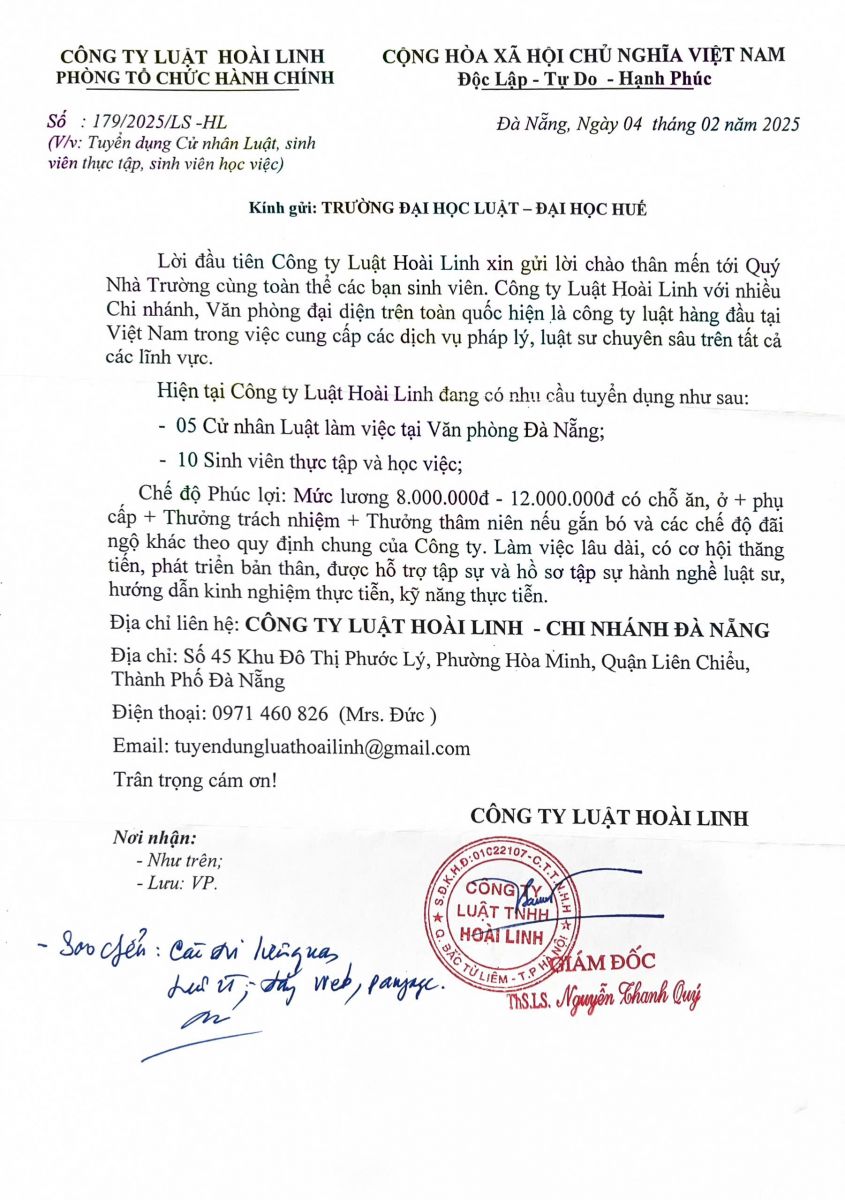 Công ty Luật Hoài Linh thông báo tuyển dụng