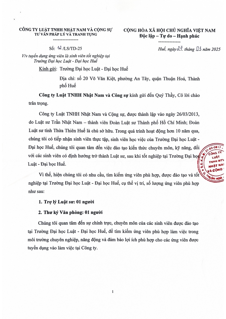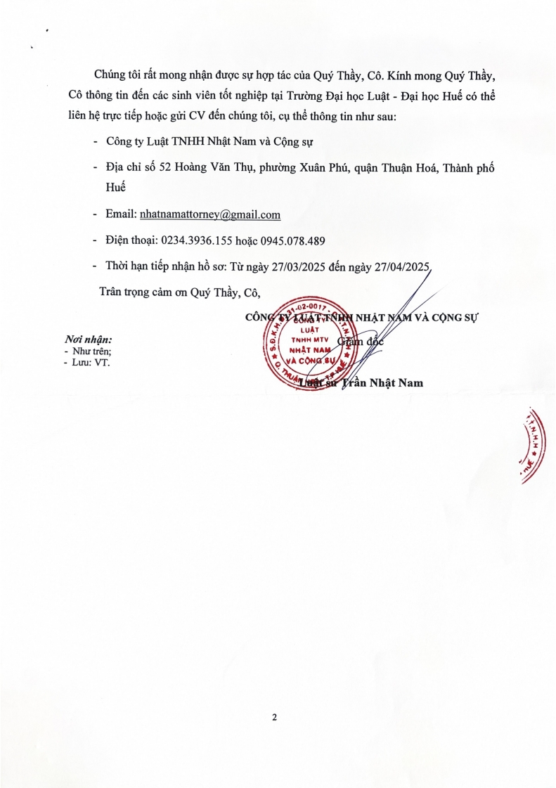 Công ty Luật TNHH Nhật Nam và Cộng sự thông báo tuyển dụng