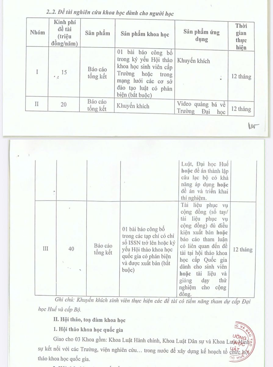 - Chủ nhiệm đề tài phải là sinh viên có học lực loại giỏi trở lên trong năm học vừa rồi và đang theo học năm thứ hai hoặc thứ ba tại trường Đại học Luật, Đại học Huế (K48, K47). Thành viên của đề tài có thể bao gồm sinh viên đang theo học tại trường các khóa K49, K48, K47 và K46.