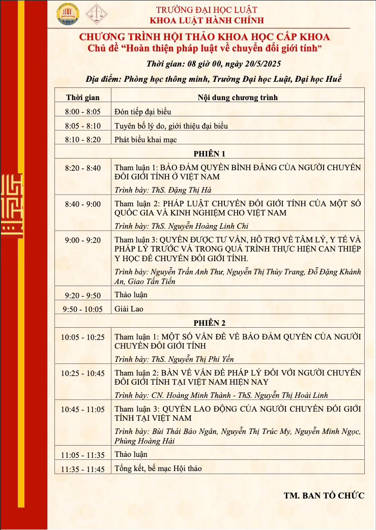 THÔNG TIN TỔ CHỨC CHƯƠNG TRÌNH HỘI THẢO KHOA HỌC CẤP KHOA VỚI CHỦ ĐỀ "HOÀN THIỆN PHÁP LUẬT VỀ CHUYỂN ĐỔI GIỚI TÍNH" KHOA LUẬT HÀNH CHÍNH NĂM 2025