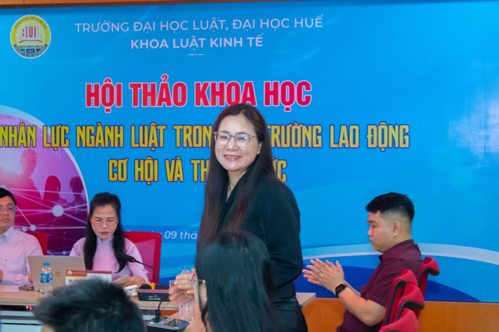 Phát biểu khai mạc Hội thảo, TS.GVC Đào Mộng Điệp - Trưởng khoa Luật Kinh Tế bày tỏ sự vinh dự khi Khoa được đón tiếp quý đại biểu, chuyên gia và các bạn sinh viên đến tham dự. Hội thảo lần này là không gian kết nối, giao lưu và trao đổi học thuật, thực tiễn, góp phần nâng cao nhận thức về những cơ hội và thách thức trong quá trình phát triển nhân lực ngành Luật trong bối cảnh hiện nay. Bên cạnh đó, Hội thảo cũng là dịp để các bạn sinh viên tiếp cận trực tiếp với các yêu cầu tuyển dụng thực tế, hiểu rõ hơn về kỹ năng cần có và những xu thế mới như trí tuệ nhân tạo (AI), chuyển đổi số trong lĩnh vực pháp lý. Cuối cùng, gửi lời cảm ơn đến Đảng ủy Trường Đại học Luật, Đại học Huế, Phòng KHCN&HTQT Trường Đại học Luật, Đại học Huế, các đại diện văn phòng Luật sư, các nhà khoa học, giảng viên, sinh viên viết bài tham dự đóng góp sự thành công cho hội thảo.